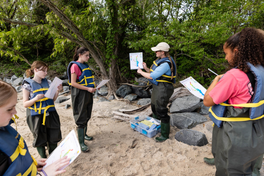 ShoreRivers environmental educator Morgan Buchanan shows ninth-grade students from St. Michaels Middle High School a map of salinity in the Chesapeake Bay before they take measurements themselves from the shoreline of the Choptank River. (Photo by Will Parson/Chesapeake Bay Program)