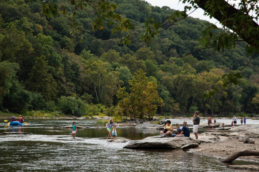 People lounge next to and wade into the Shenandoah River near where it meets the Potomac River at Harpers Ferry, W.Va., on Sept. 28, 2015. (Photo by Will Parson/Chesapeake Bay Program)