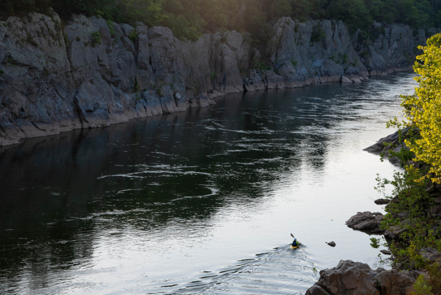 A kayaker paddles on the Potomac River in Great Falls Park in Potomac, Md., on July 13, 2018. Great Falls is often used as an area to train for white water kayaking, but there are restictions as to how close to the falls kayakers can go. (Photo By Kaitlyn Dolan/Chesapeake Bay Program)