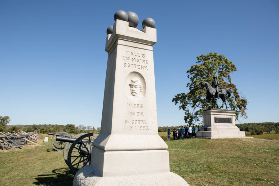 A monument stands near a statue of Major General John Fulton Reynolds of the United States Volunteers at Gettysburg National Battlefield in Adams County, Pa., on Oct. 2, 2017. (Photo by Will Parson/Chesapeake Bay Program)