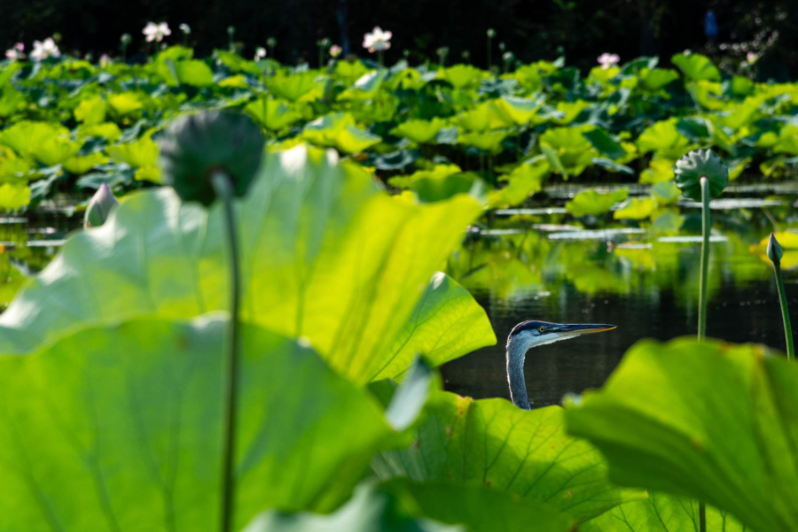 A great blue heron hunts among the water lilies at Kenilworth Aquatic Gardens in Washington, D.C., on Aug. 14, 2018. (Photo By Kaitlyn Dolan/Chesapeake Bay Program)