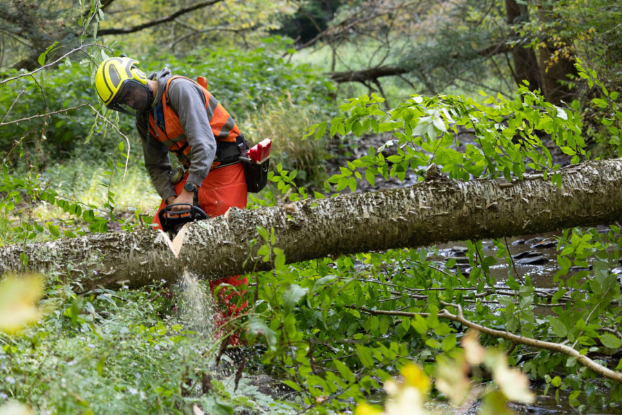 Biologists who conduct this work either move a tree that’s died in a nearby forest or cut down one that is already showing signs of decay. The foresters then move pieces of the tree and strategically cut it before placing it in the river.