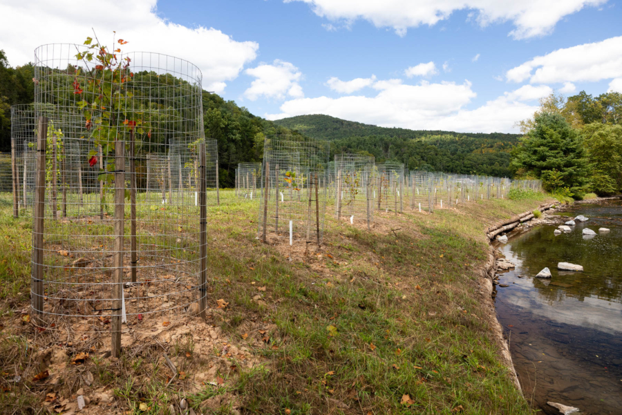 In 2023, at their Oxbow project site in Clinton County, Trout Unlimited and KCWA installed a feature known as a log vane within the stream to push water away from the banks, as well as a series of strategically placed logs and rocks, known as a mud-sill, to narrow the streambank. Then, in spring 2024, they planted a forest buffer to help reduce erosion, filter water and provide shade.