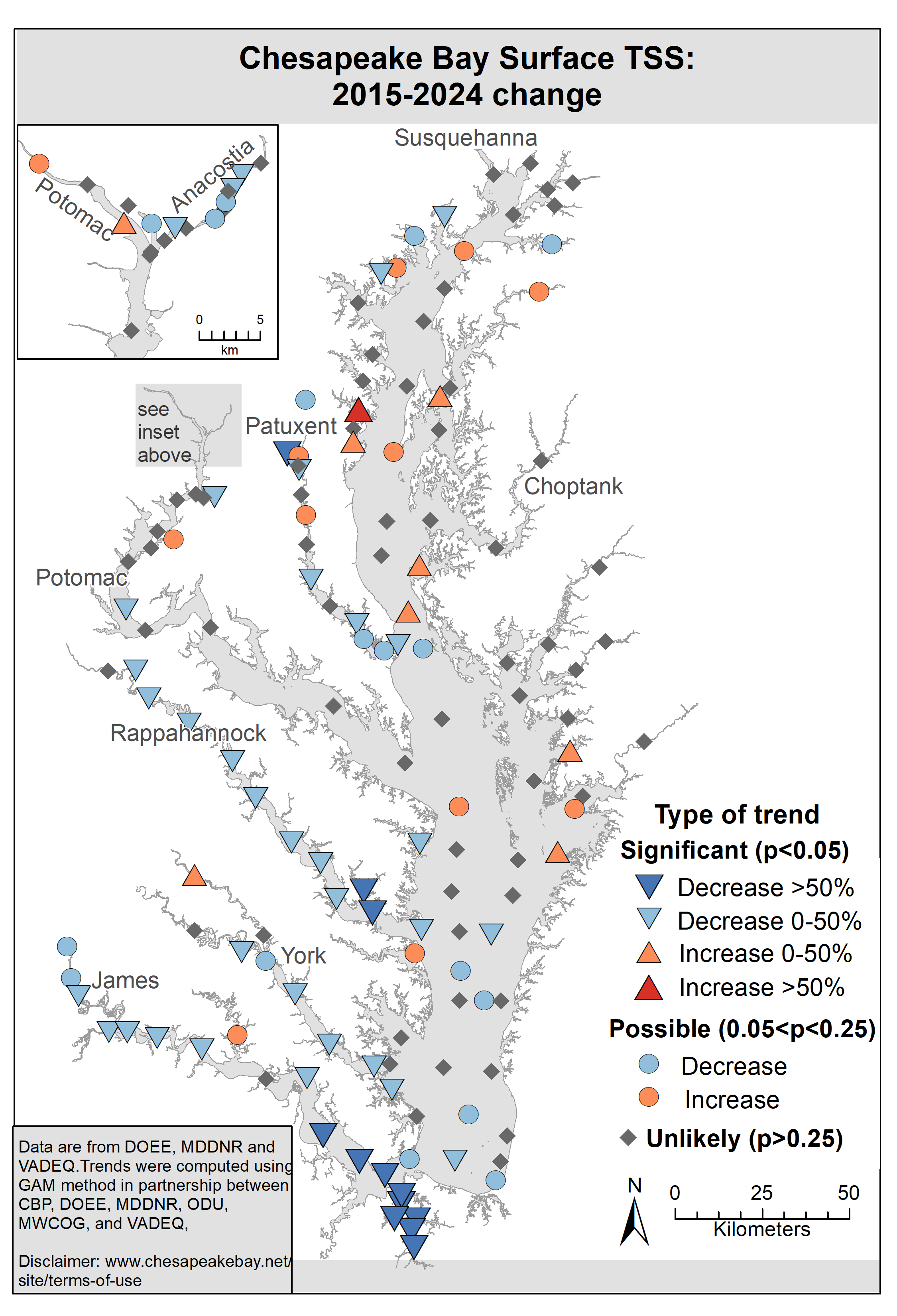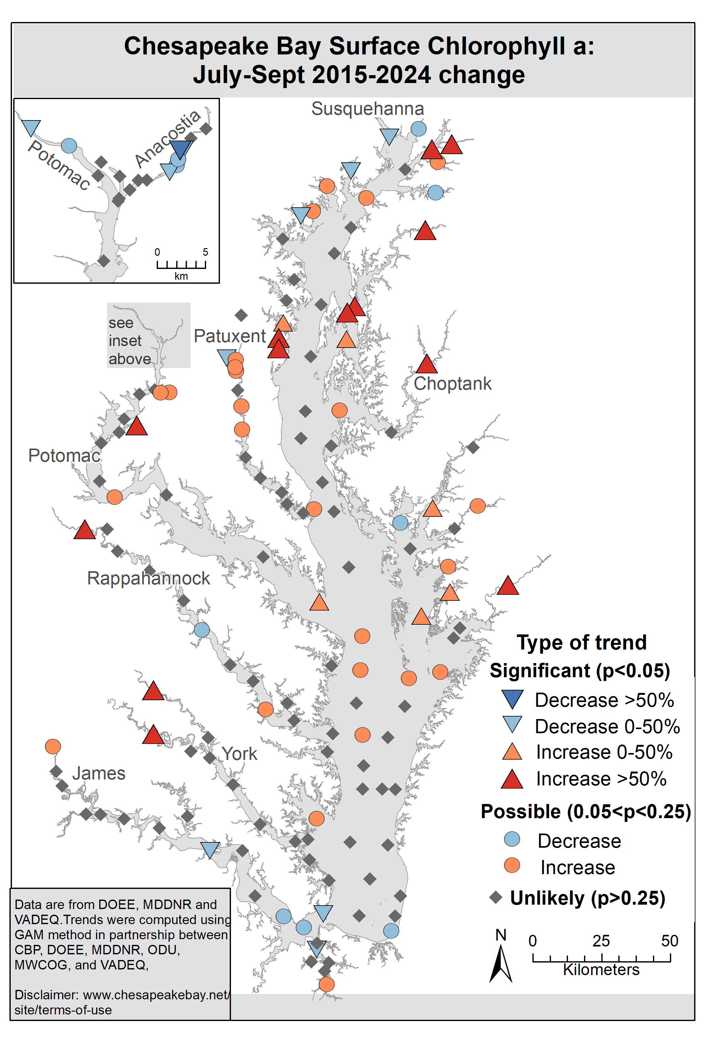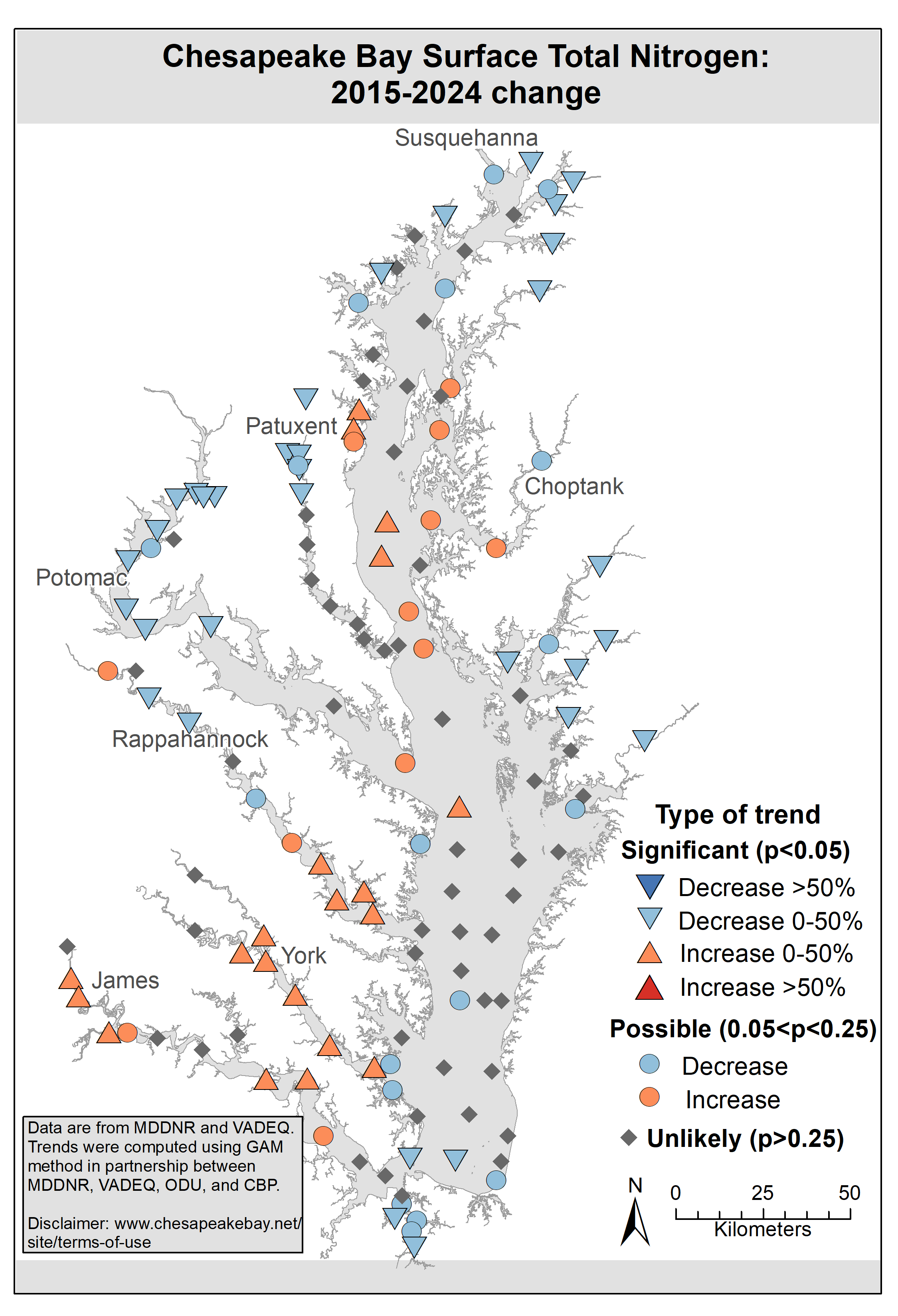 Observed change in water quality by station over the last 10 years (2015-2024).