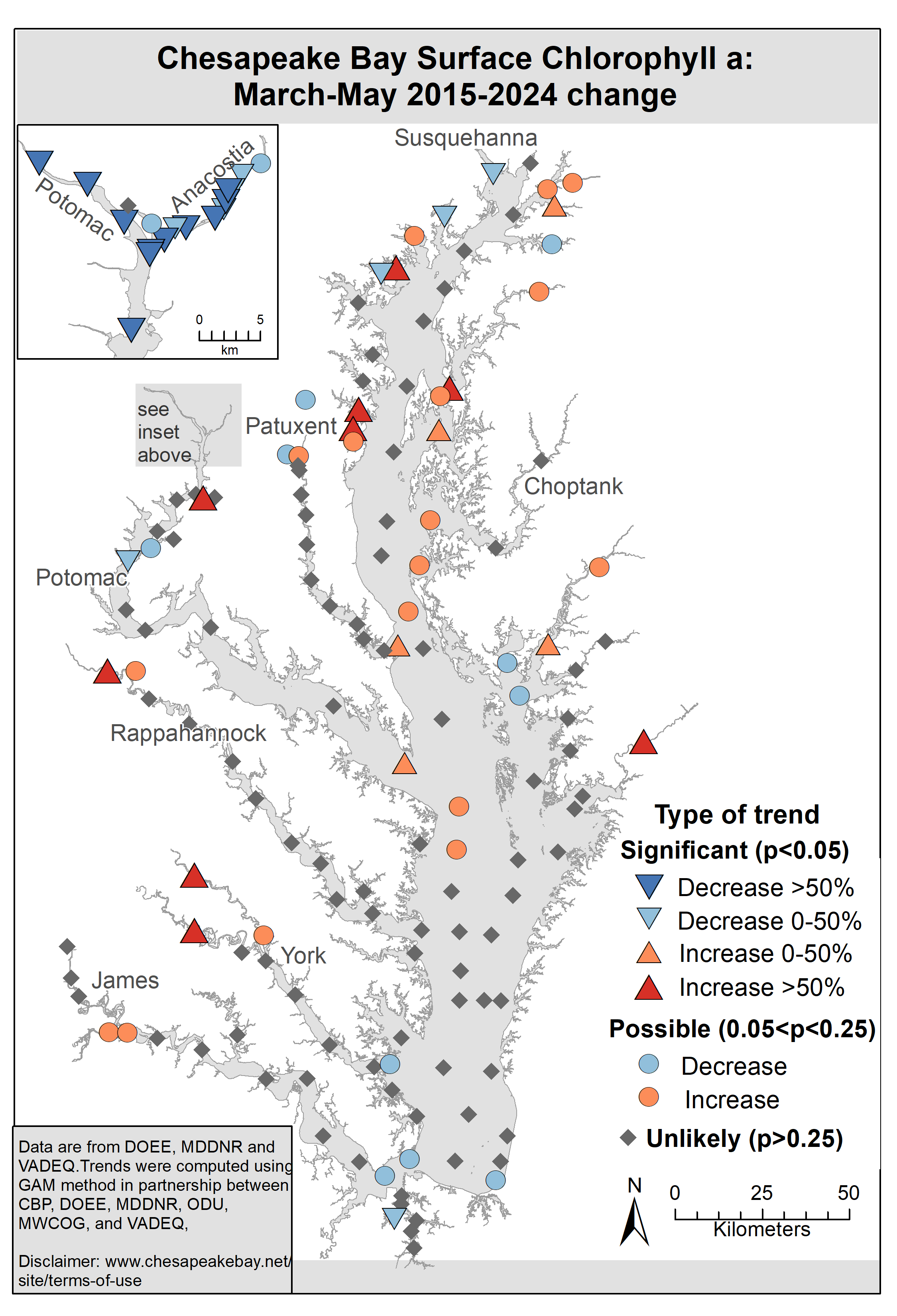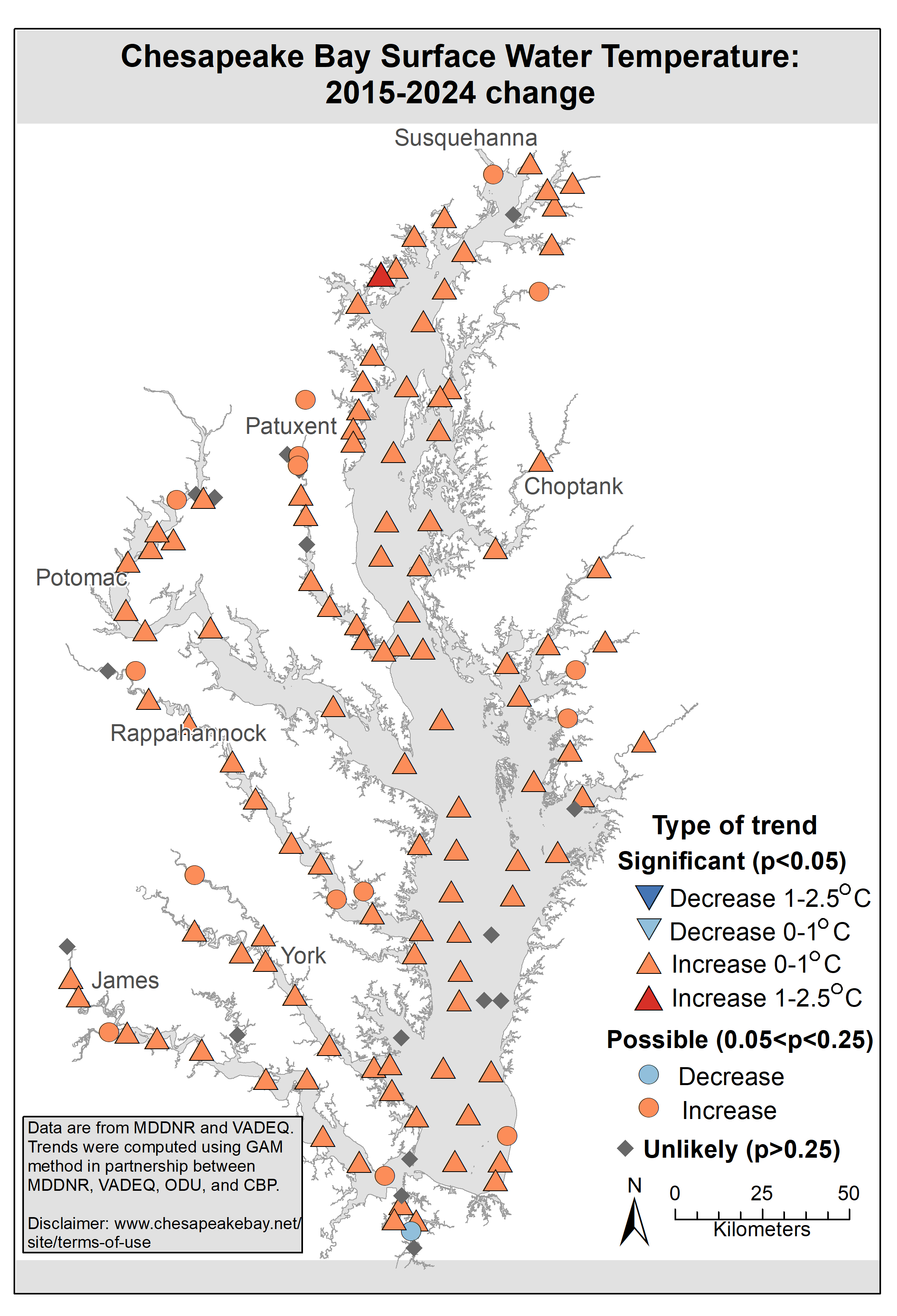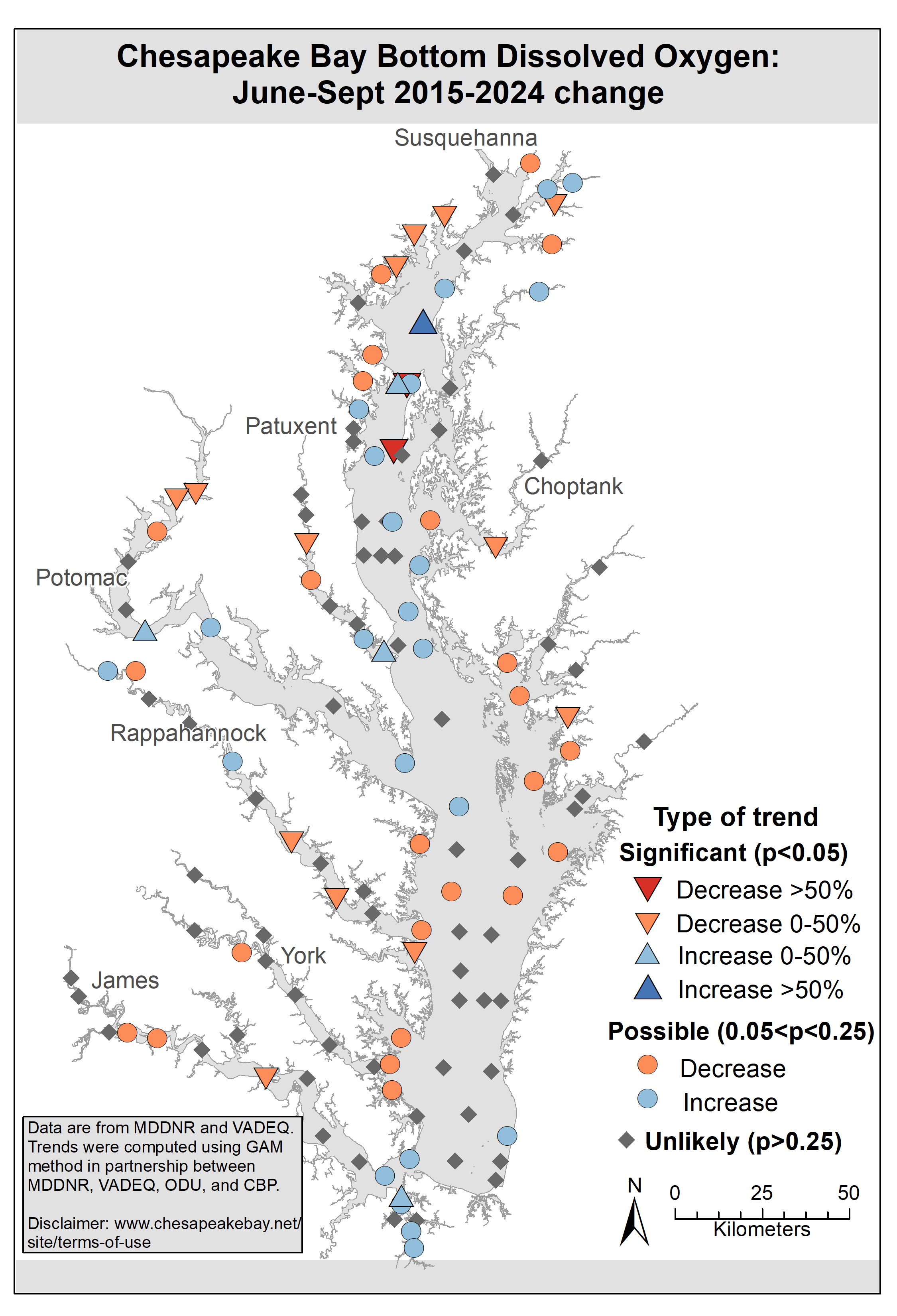 Observed change in water quality by station over the last 10 years (2015-2024).
